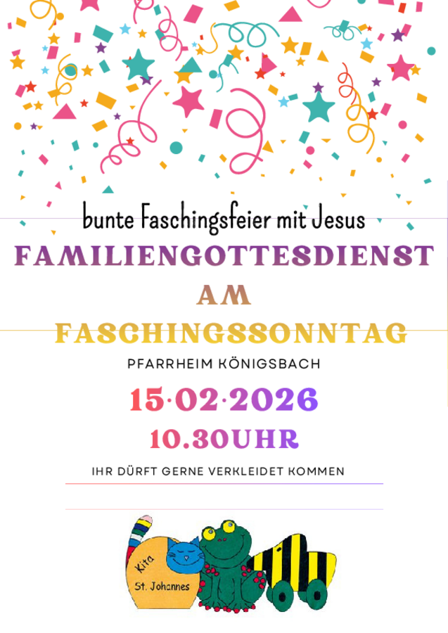 Die Gemeinde Königsbach lädt gemeinsam mit der katholischen Kita St. Johannes Königsbach zu einem bunten Familiengottesdienst am Faschingssonntag ein. Der Gottesdienst steht unter dem Motto "bunte Faschingsfeier mit Jesus". Zu diesem besonderen Gottesdienst dürfen die Kinder gerne verkleidet kommen.